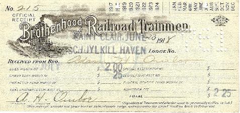 | This membership card is for the Brotherhood of Railroad Trainmen issued in 1918. It belonged to Adam Omlor, a member of the Schuylkill Haven Lodge. It was this lodge that was involved in the court case mentioned above. |