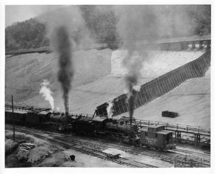 | This early image at left shows a crew unloading coal from a railroad car at the coal storage yard on the Schuylkill Mountain . |